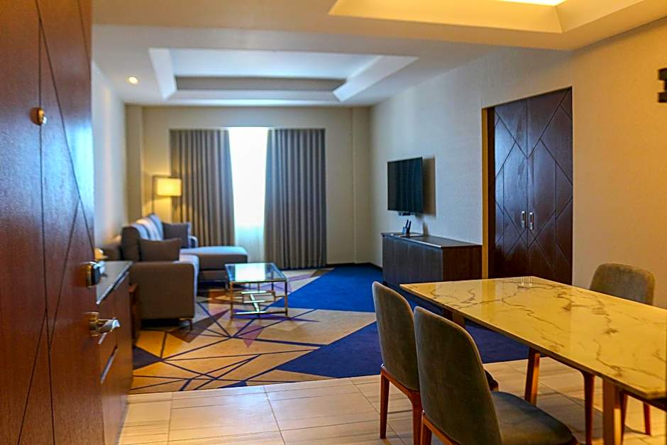This suite features a living room, dining area, jacuzzi, bath tub, smart TV, coffee machine, and microwave.